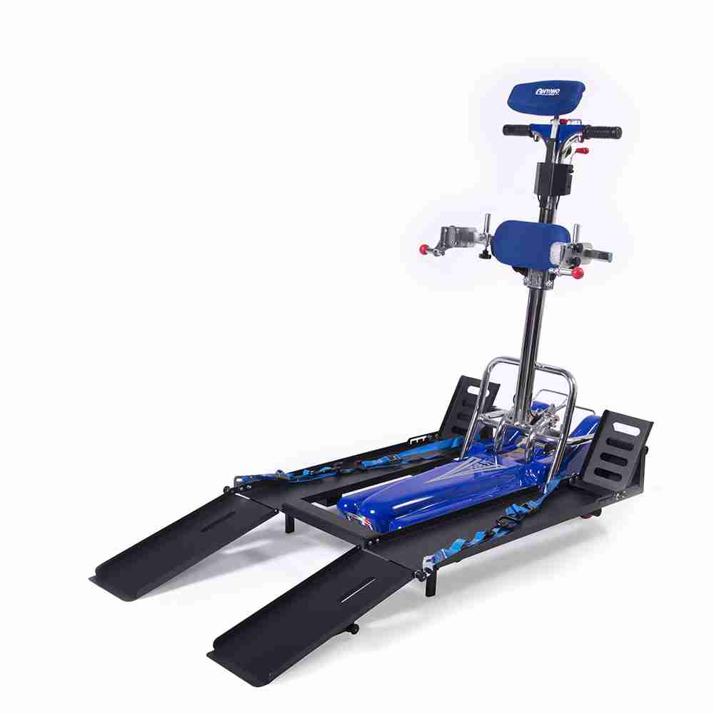 Estructura en caño cromado, cuerpo azul.